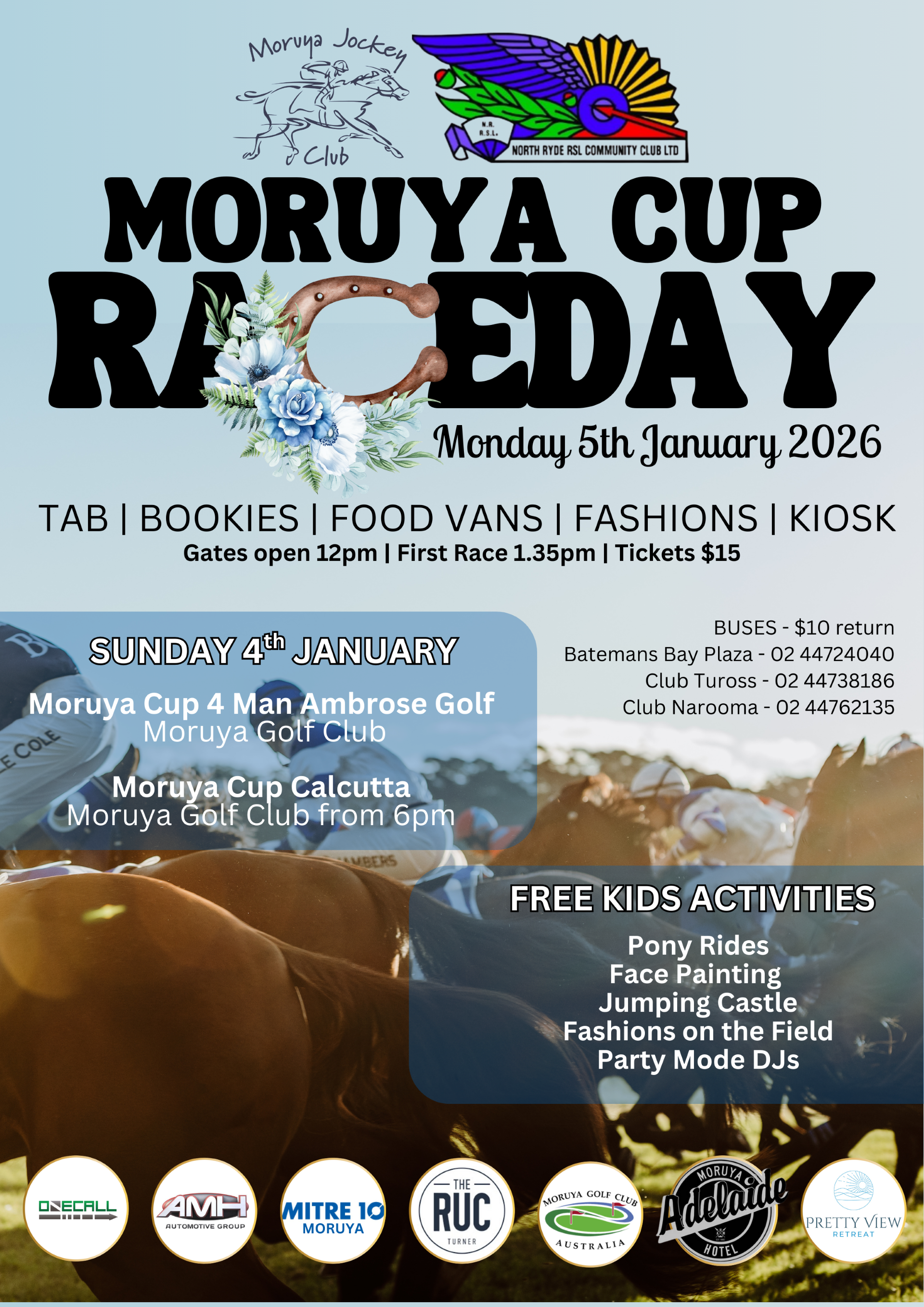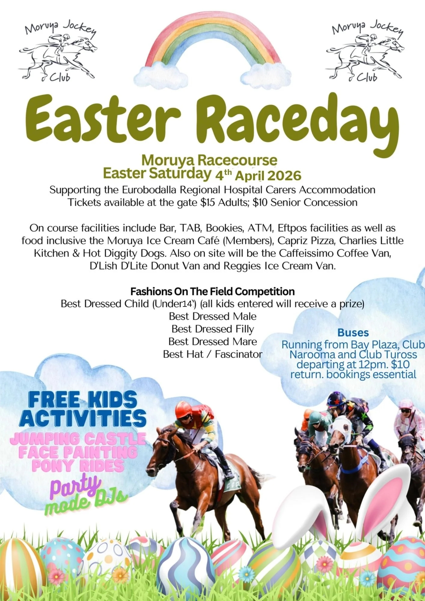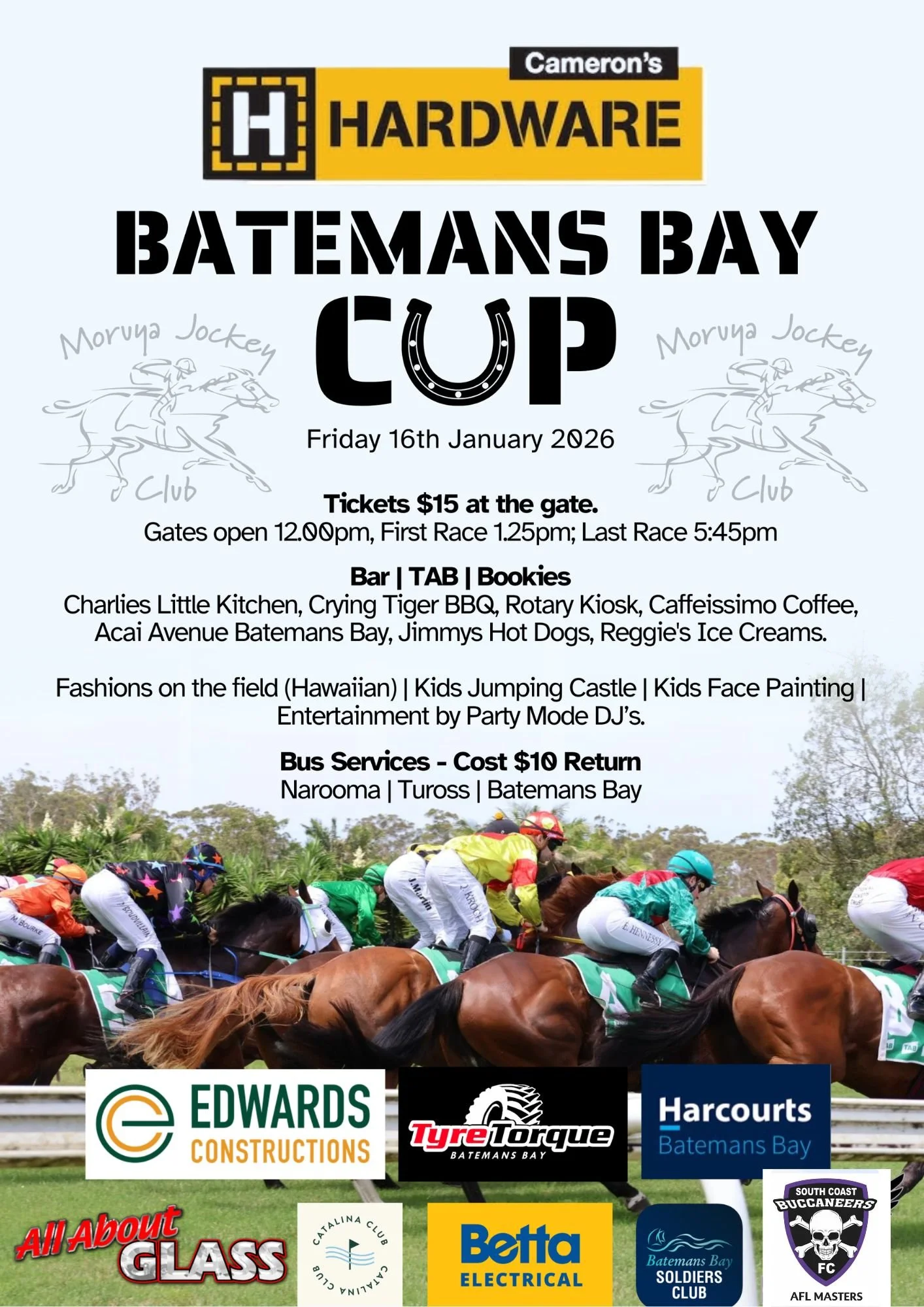 Enjoy a full day of racing with all facilities on hand — Bar, TAB, Bookies, ATM and EFTPOS — plus an incredible food lineup featuring Moruya Ice Cream Café (Members), The Rotary Kiosk, Charlie’s Little Kitchen, Capriz Pizza, Crying Tiger BBQ, Caffeissimo Coffee Van, Hot Diggity Dogs, Reggie’s Ice Creams and D’lish D’lite Donuts. Come hungry — you’ll be spoiled for choice!